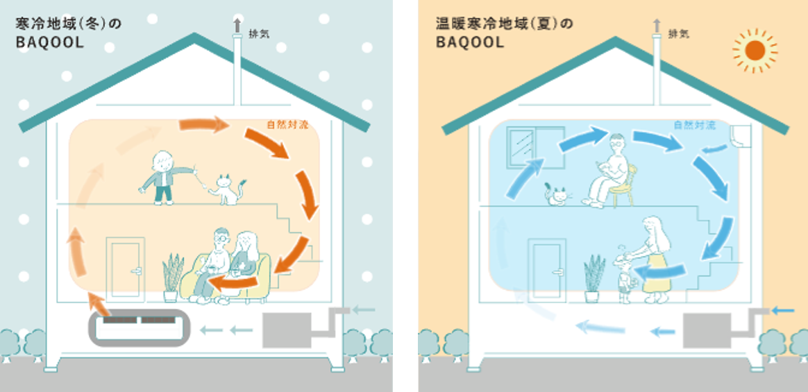 プラスホームの換気システムは自然の力だけで空気を循環していく方法で換気設備を一切使用致しません。熱源となるのはなんと「エアコン1台」だけなのです。結果、全館空調の最大のデメリットであるイニシャルコスト(初期コスト)とランニングコスト(光熱費)そして、メンテナンスコスト(修繕コスト)を大幅にカットすることが可能になります。