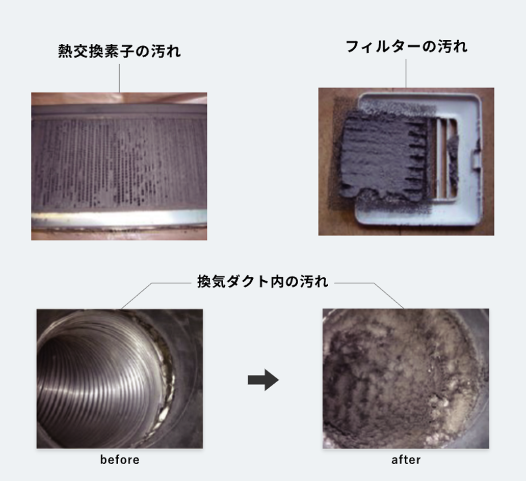 上記の画像を見てもらうと、わかる通り換気設備を使用したシステムでは、時期が経つと換気システムに汚れがこびりついてしまい、故障や換気不良の原因になります。結果、換気システムのメンテナンスコストも必要となり、余計な費用が掛かってしまいます。