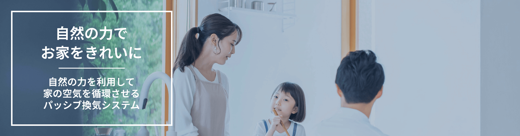 機械設備を用いずに自然な空気の流れだけで家中を換気する 「パッシブ換気」を基にした特許取得の換気システムをプラスホームでは取り入れています。 給気口から取り込まれた新鮮な外気を床下で温め、家全体を暖房します。 暖かい空気は家中をくまなく巡りながら、天井の煙突から排気されます。 暖かい空気が上昇する性能を利用したこの換気システムは、省エネかつ安全な住宅を 実現します。プラスホームのパッシブ換気を導入したお家はダクトがなく、空気の流れが非常に 穏やかな為、フィルターも不要。その為、アフターメンテナンスも最小限です。 建物自体が換気システムとなっている為、365日24時間 適切な風量の換気を続けます。