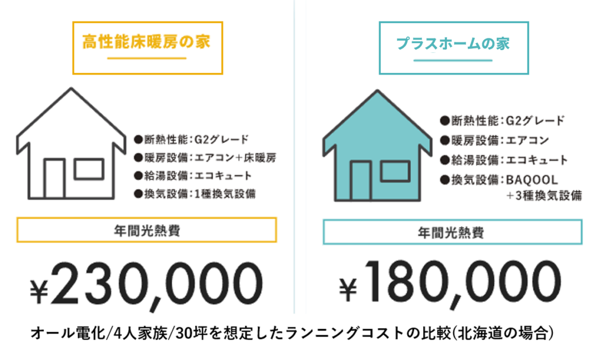 画像だけでも年間5万円もお得になります。さらにここからメンテナンスコストなどを加味すると、実質35年間で約475万円ほどのコスト削減を実現。長期に渡って安心できる。それがプラスホームの換気システムです。