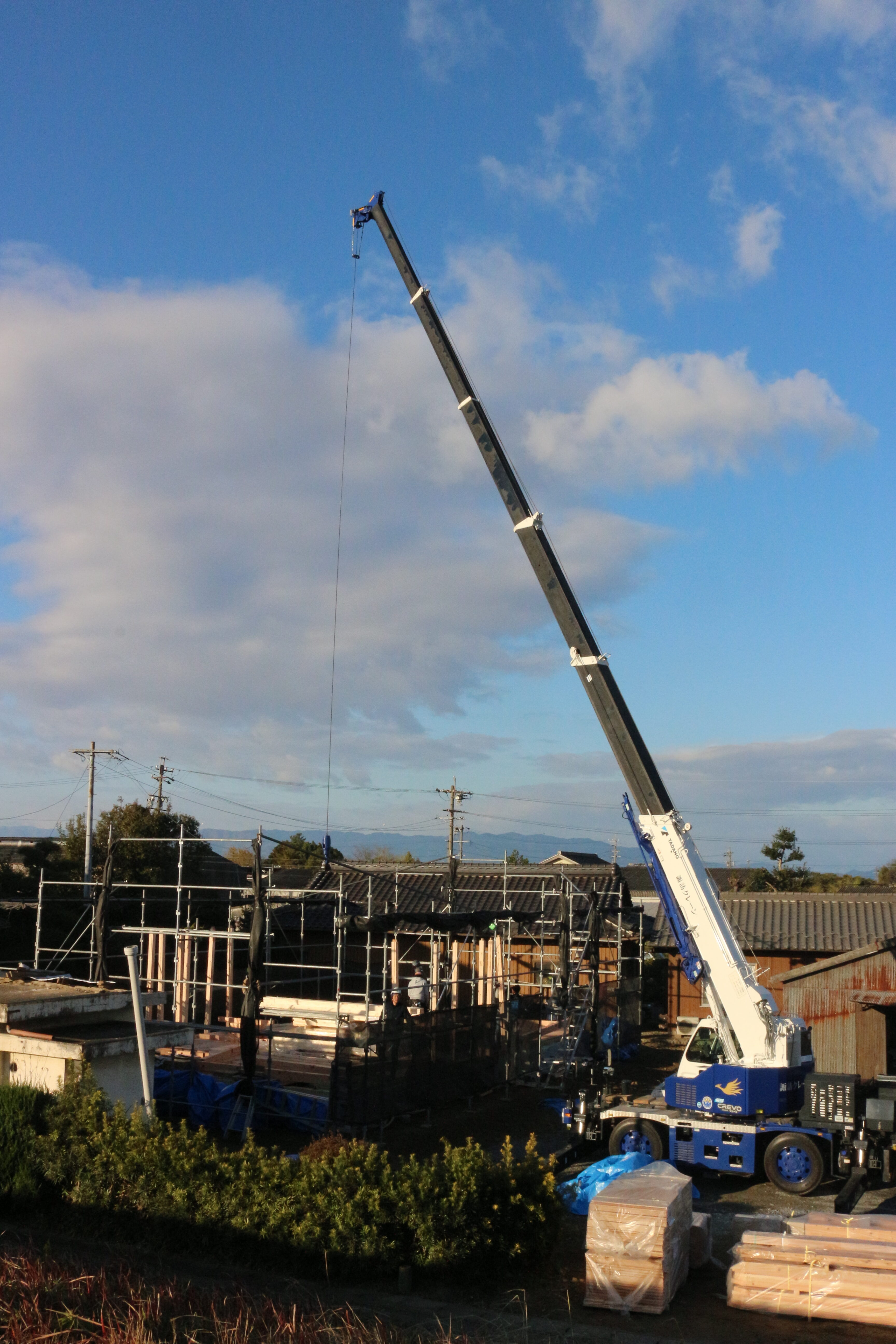 クレーンを使って重い木材を運び、手際よく柱や梁を組み上げていきます。