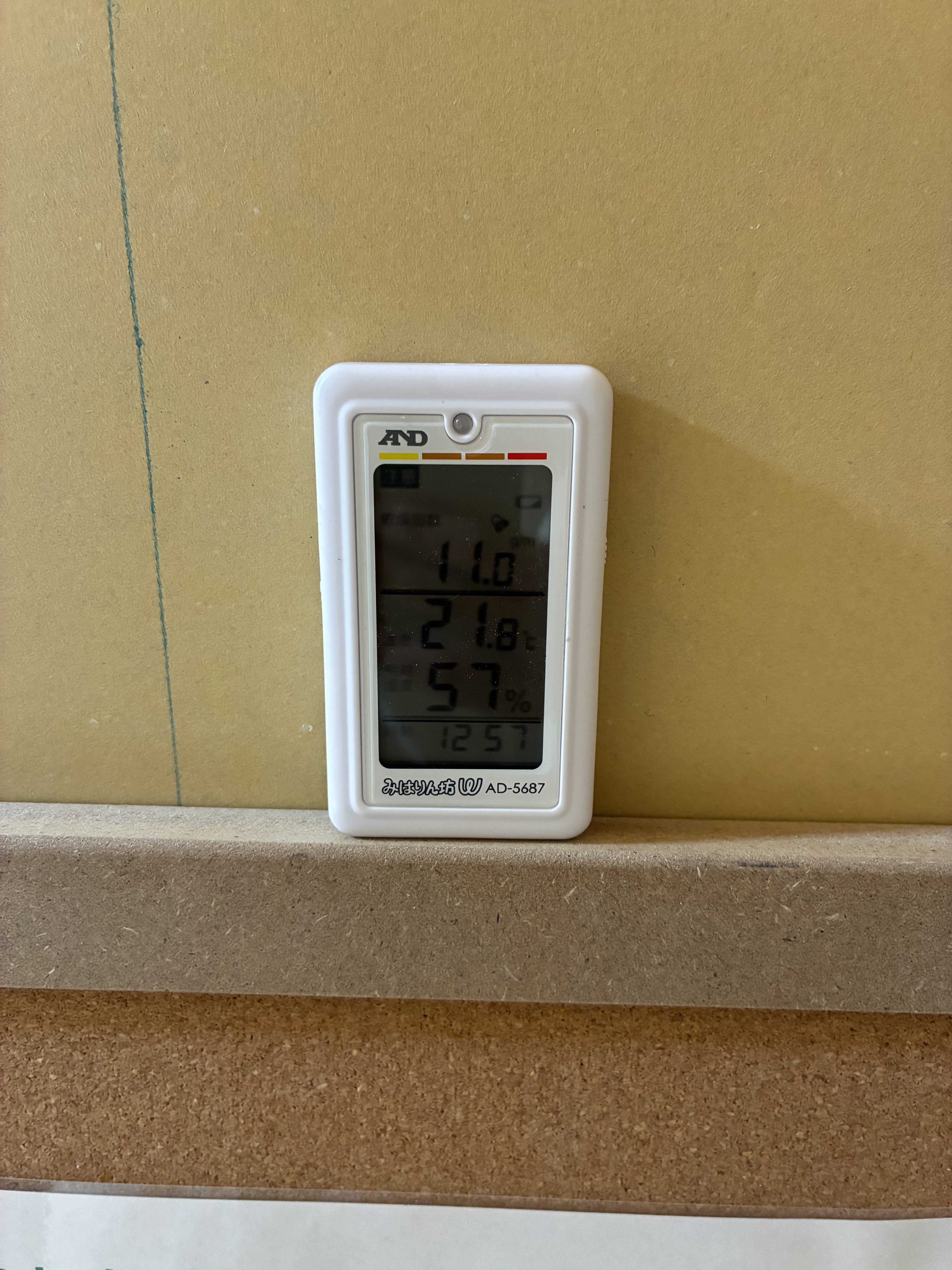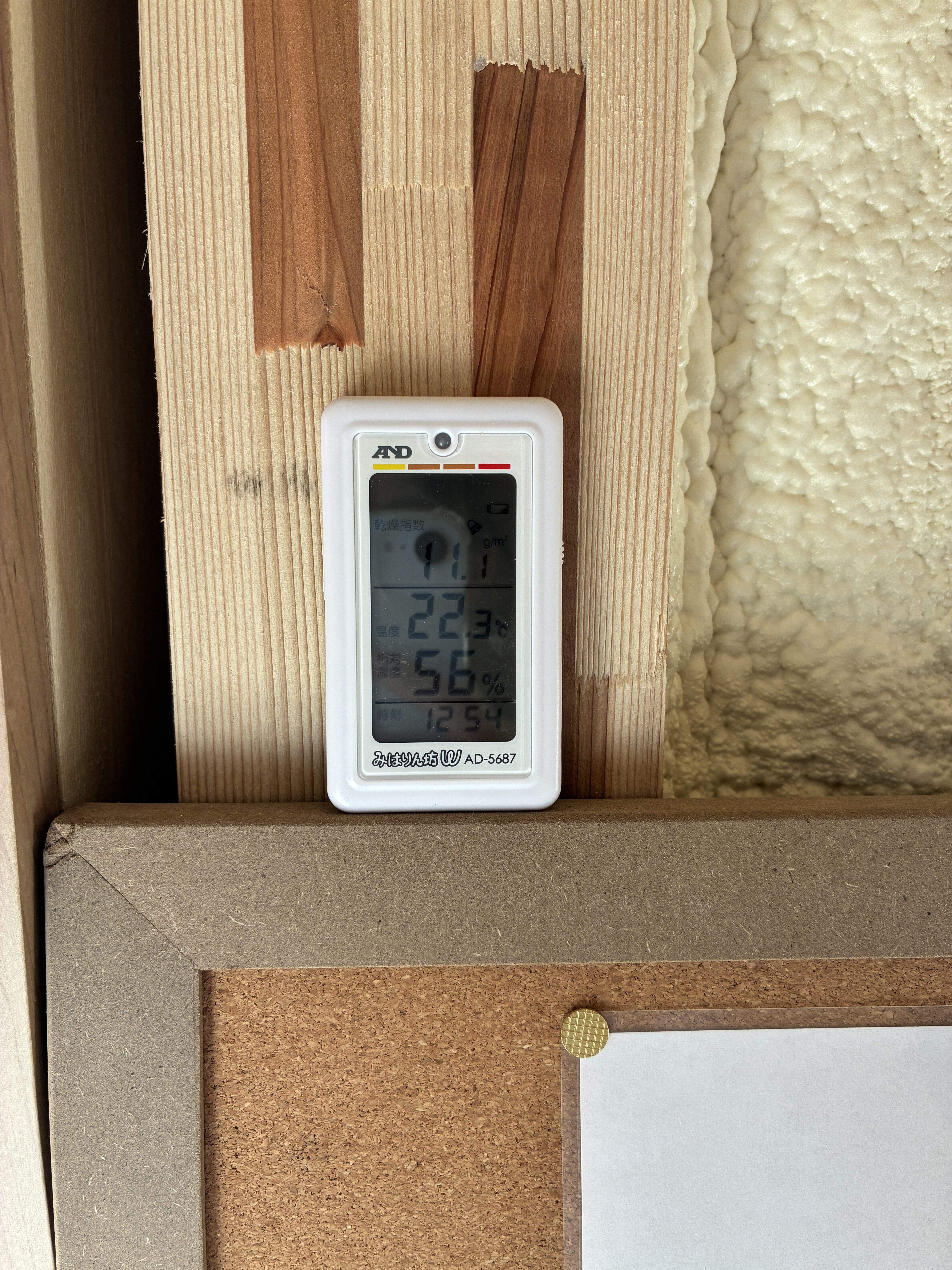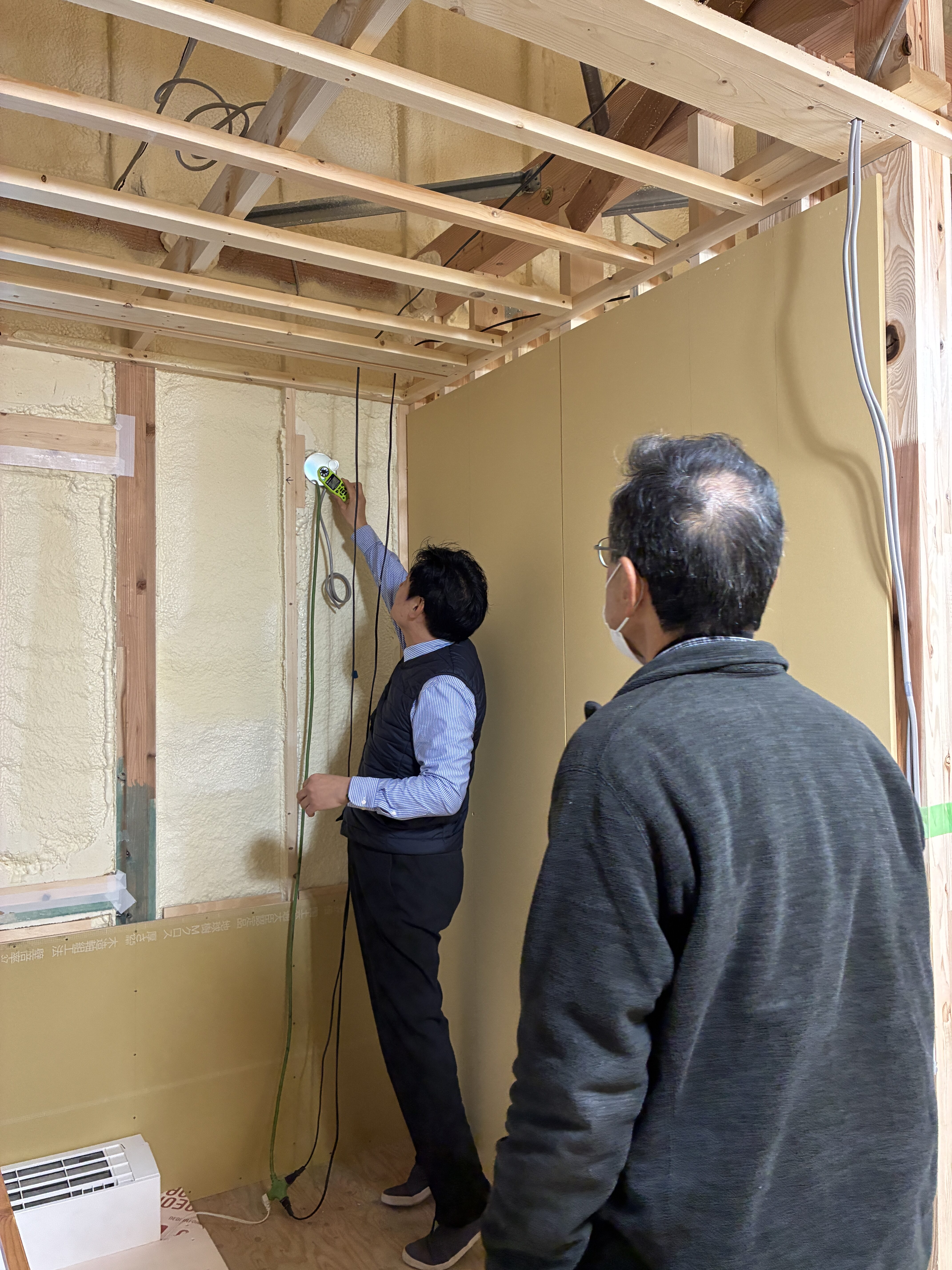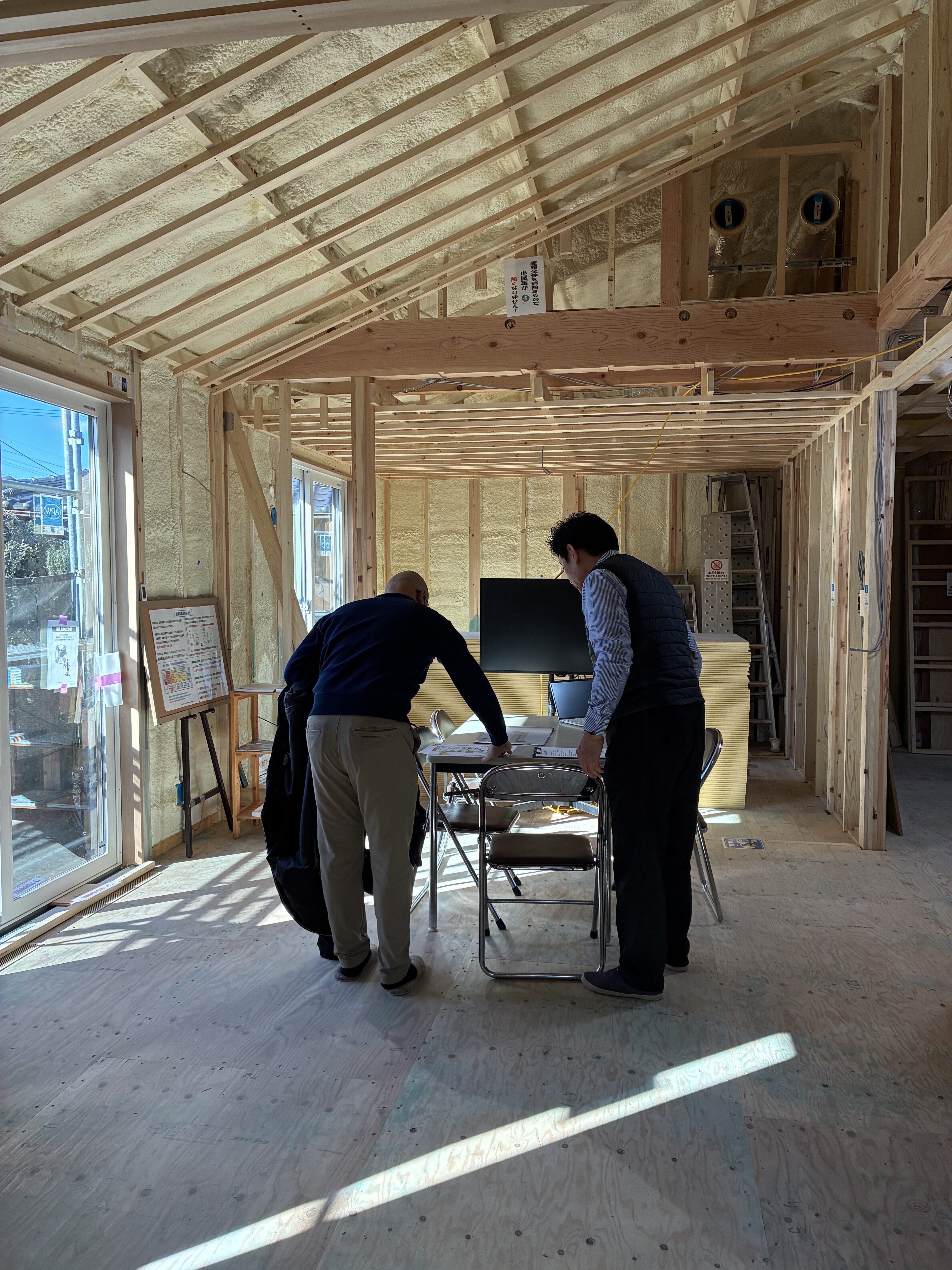 現場はまだ造作途中ですが、仮設のエアコンで暖房した状態にしています。大工さん曰く、作業していると暑いくらいだそうです(笑)