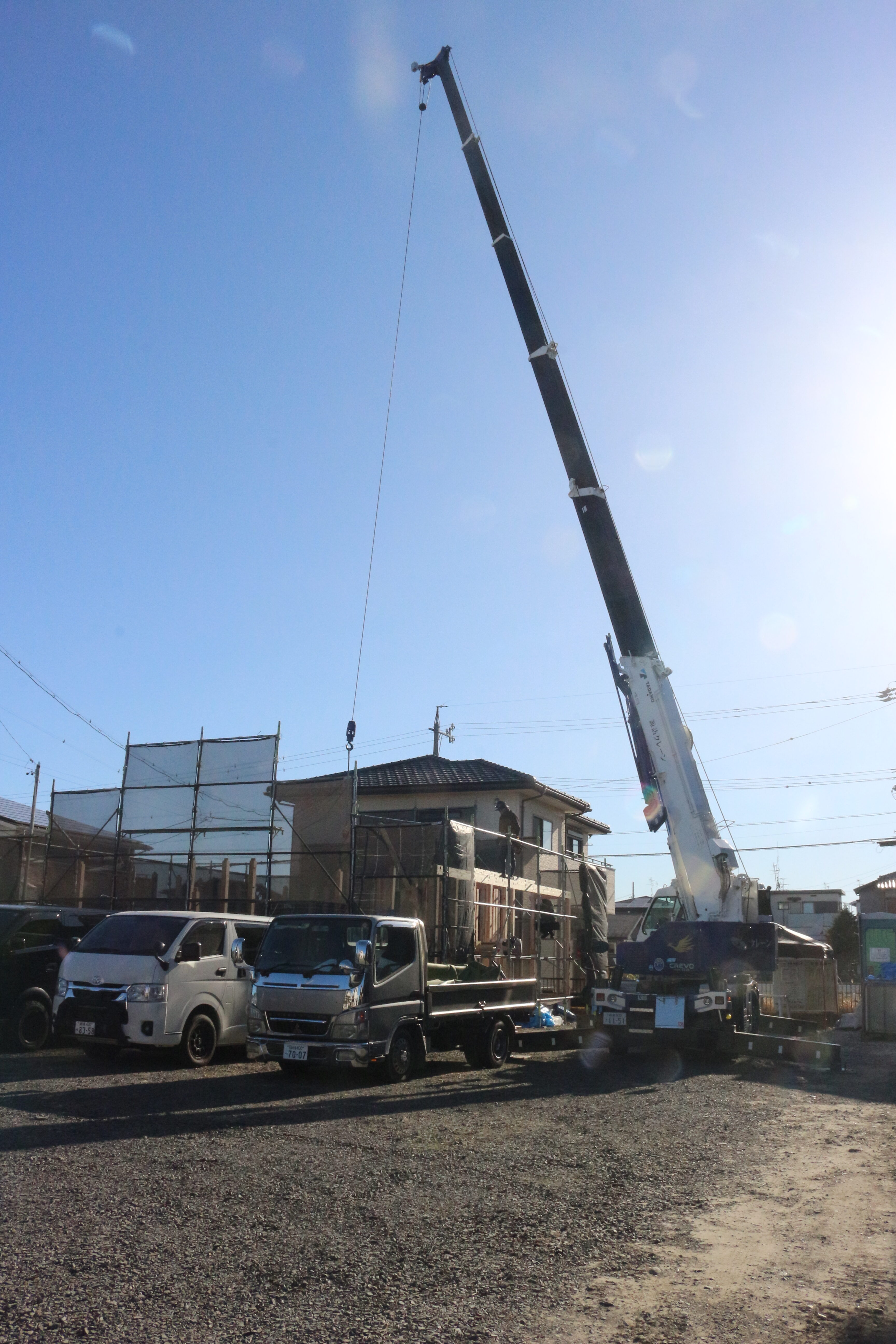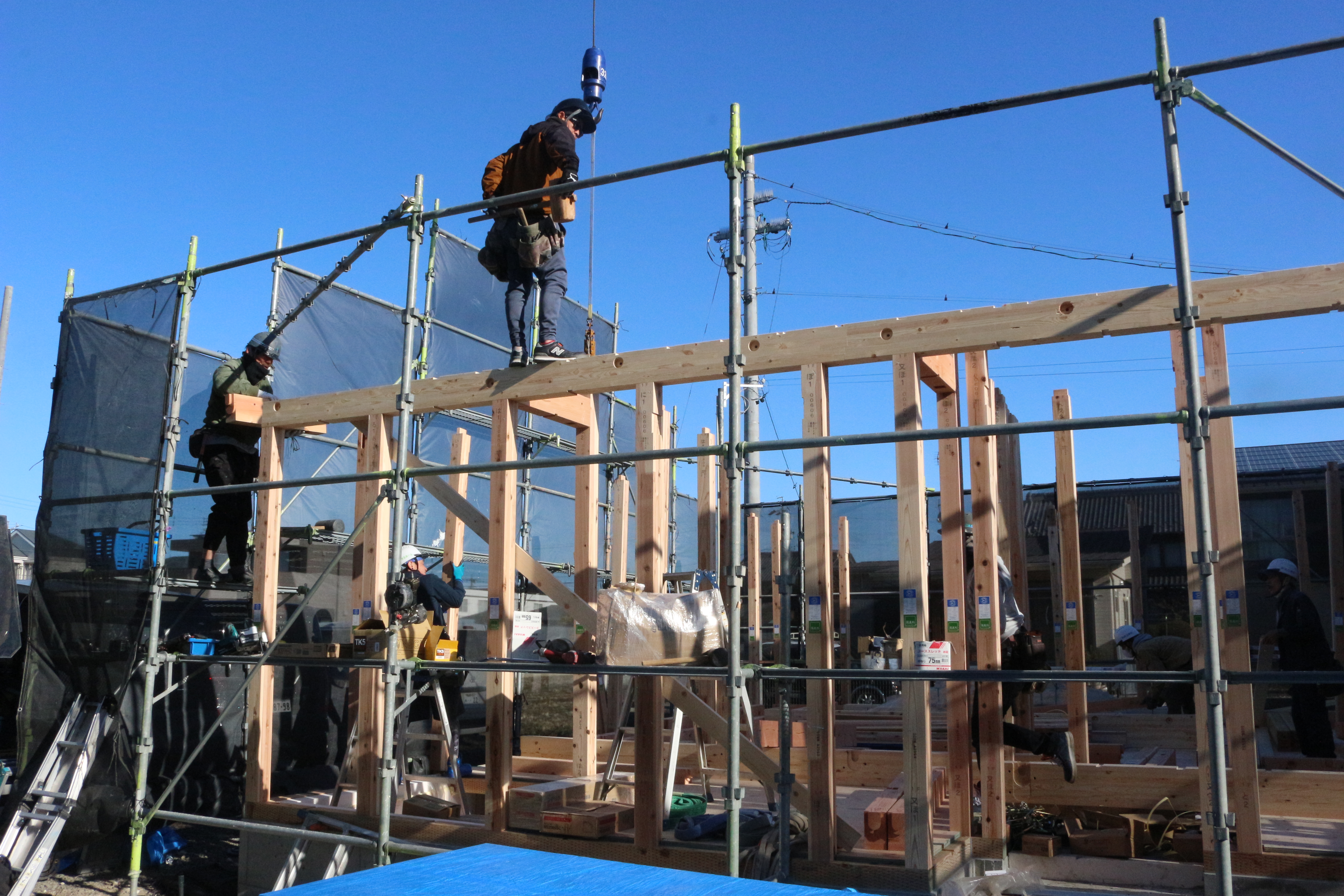 クレーンを使って重い木材を運び、手際よく柱や梁を組み上げていきます。