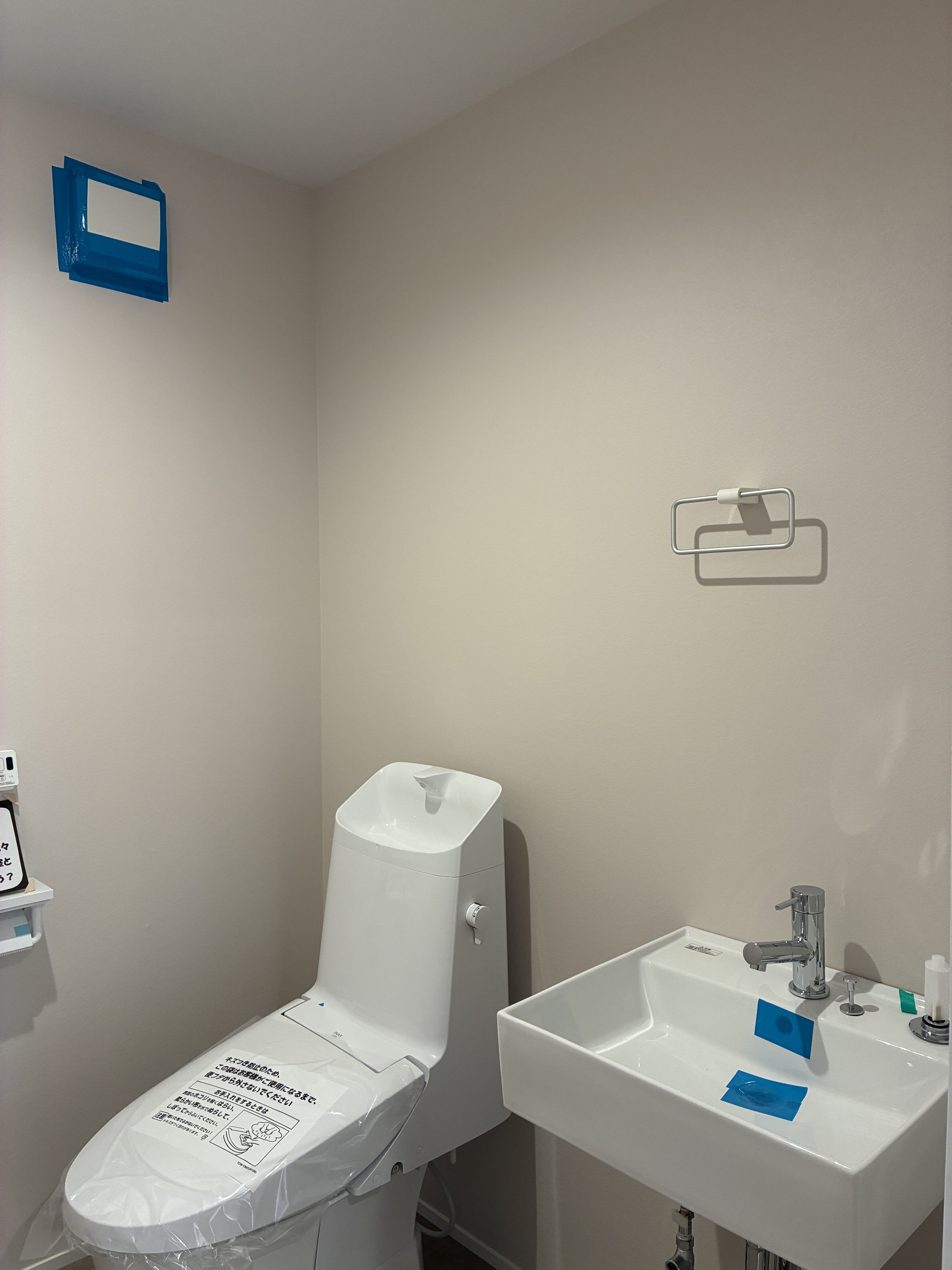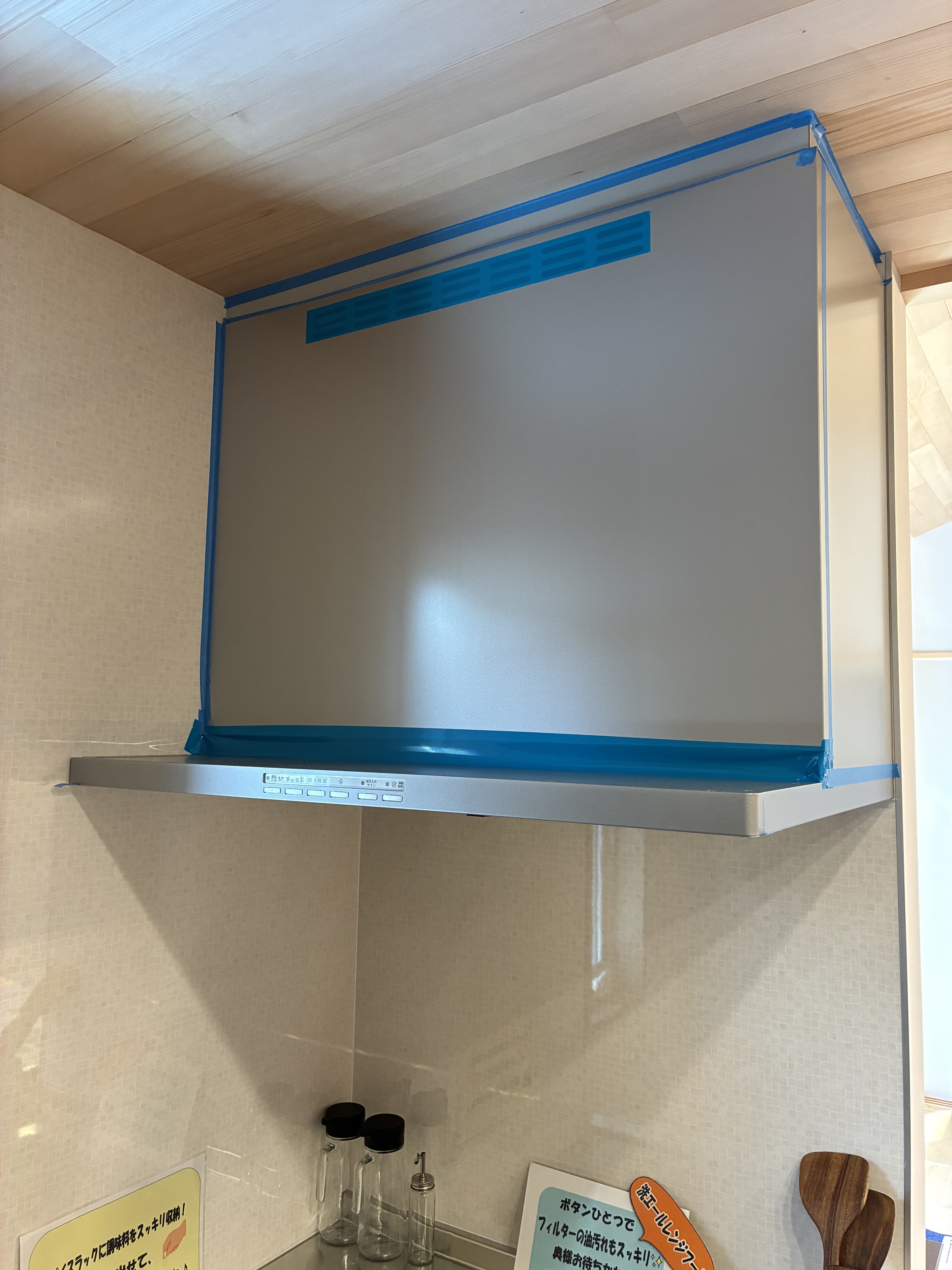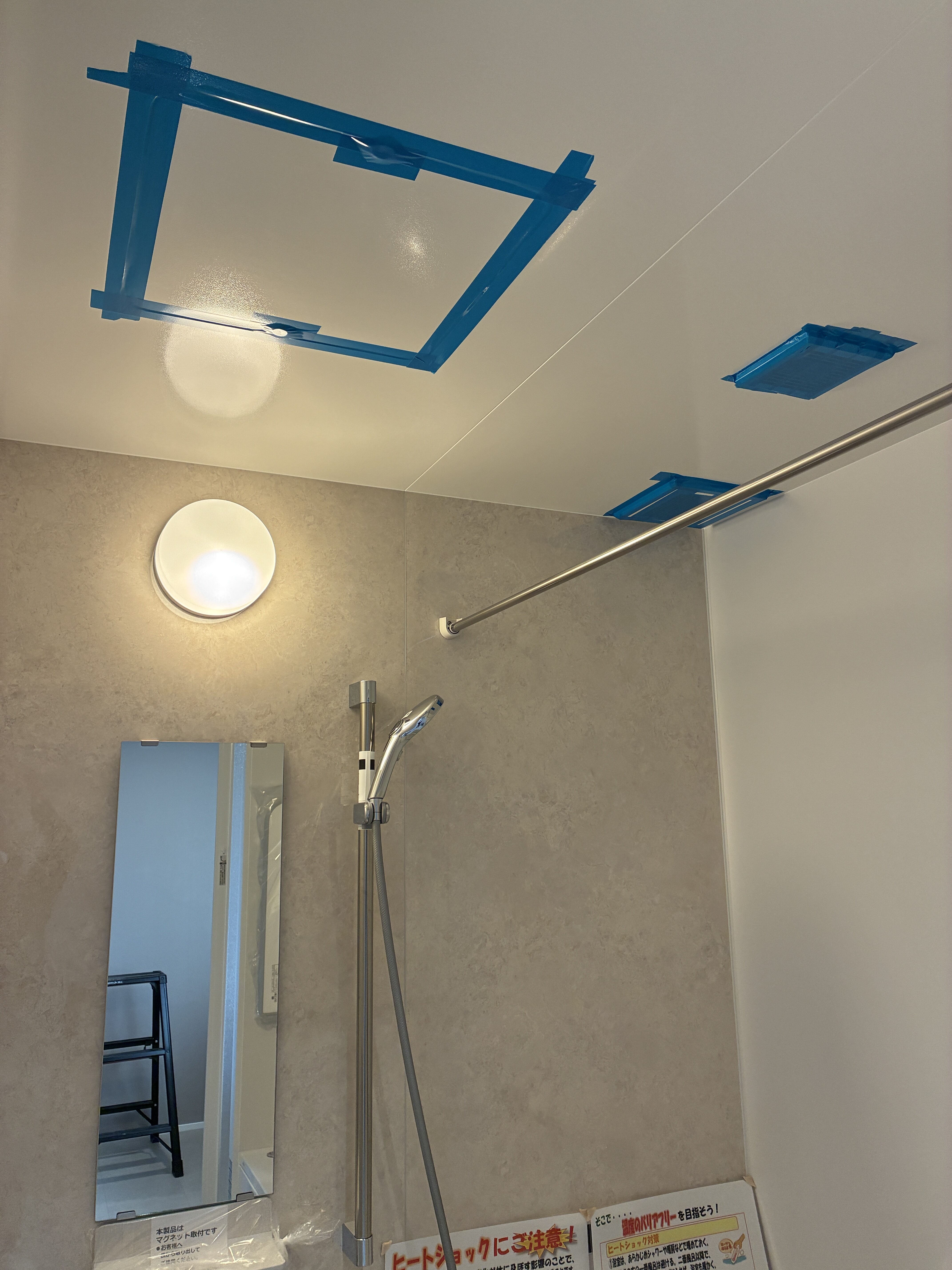 換気扇や給気口のような意図した隙間を塞ぐために目張りをしていきます。