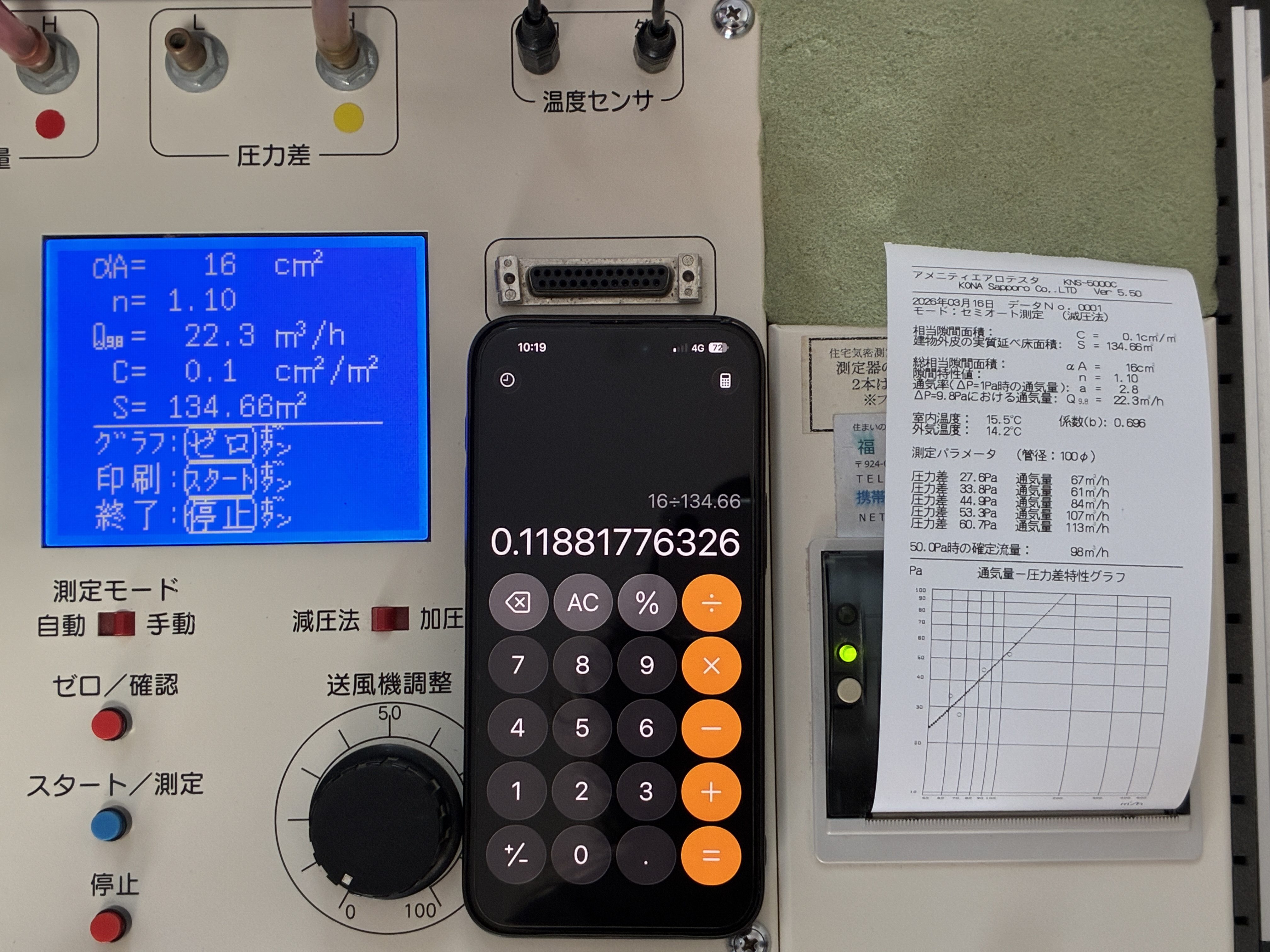 準備が整ったら、測定用機器のファンで建物内の空気を外に排出し、隙間からの空気の流入量を測定します。家の隙間を数値化することで、どれだけ家が密閉されているか(=気密性能が高いか)を客観的に知ることができます。