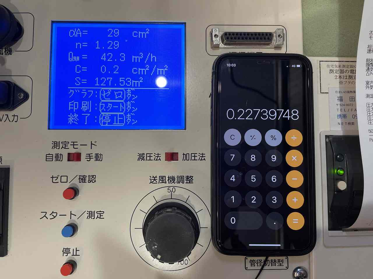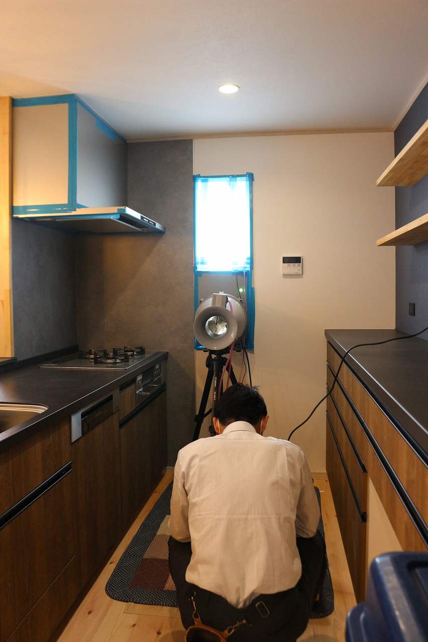 先日見学会を開催させていただいた岐阜県瑞穂市のK様邸にて、完成気密測定を行いました。
