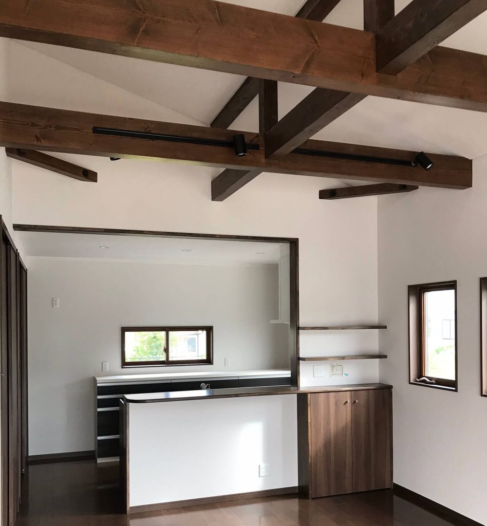 「おばあちゃんと暮らす勾配天井に化粧梁が浮かぶ平屋建ての住まい」