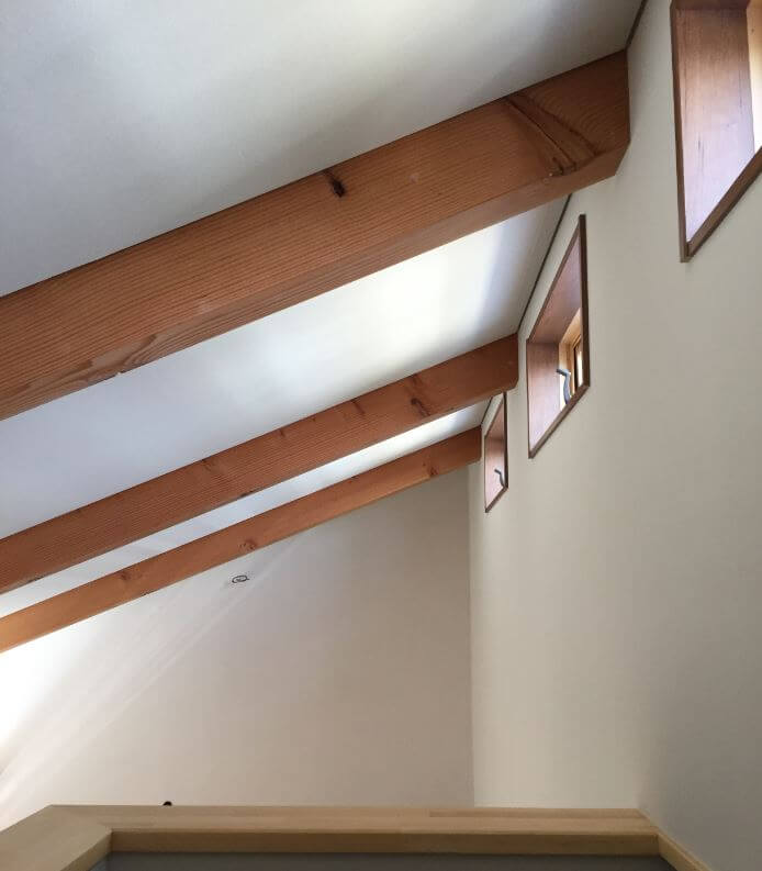 ※ロフトへ上がる階段から見た勾配天井の化粧梁です。