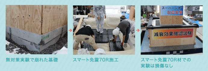 のべ47回、震度6強の地震波を発生させ、実験建物を振動させたところ、基礎にもキズひとつ付きませんでした!