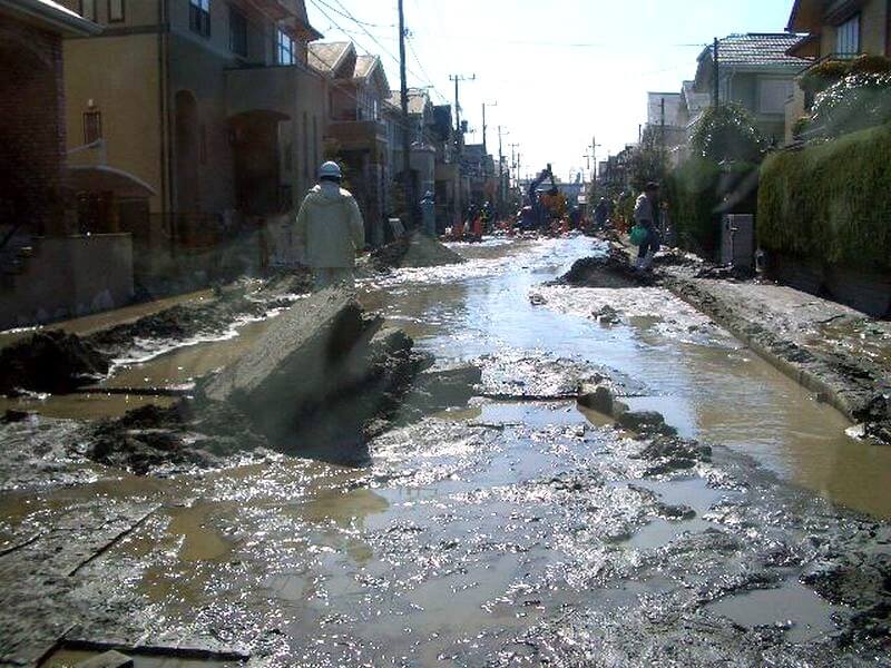 ※東日本大震災時の千葉県船橋市の住宅地(液状化で道路に水と泥が噴出しました。)