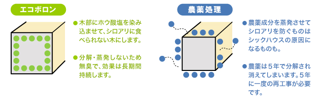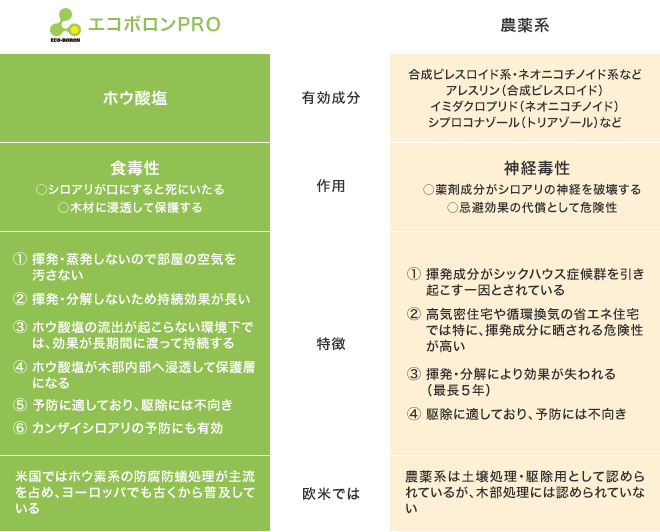 ◎人に対して毒性があり5年で効果が無くなる農薬系防蟻処理剤を使用しません。全く毒性が無く永久に効果が持続する「ホウ酸塩の防蟻処理」を採用