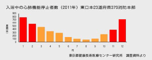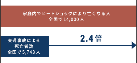 「ヒートショック」とは、温度の急激な変化で血圧が上下に大きく変動することで起こる失神や心筋梗塞、不整脈、脳梗塞などの症状のことです。入浴時に急激な血圧低下により失神し、溺れて死亡するケースは、典型的な例です。年間約1万7000人の方がヒートショックの被害を受けています。