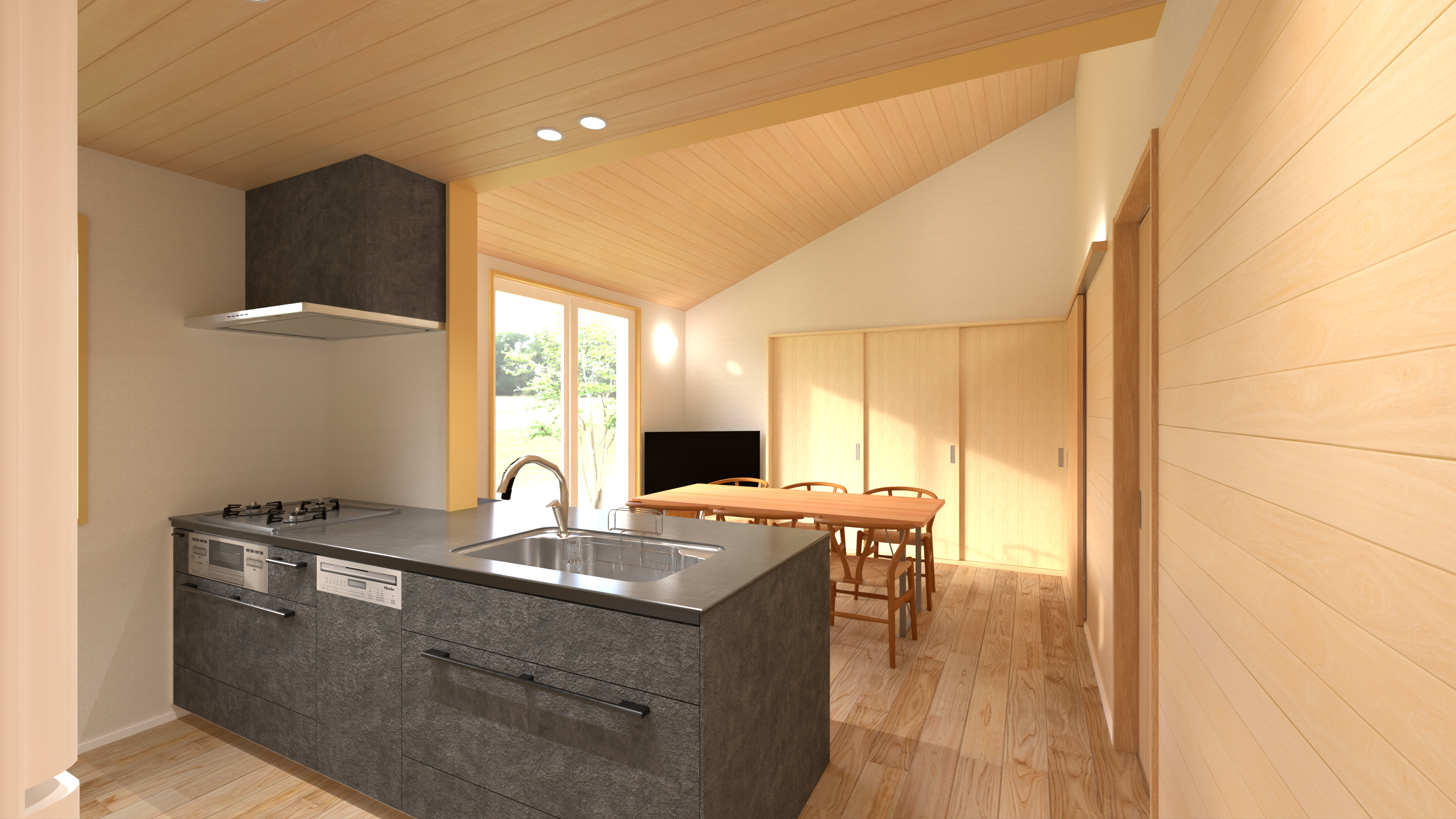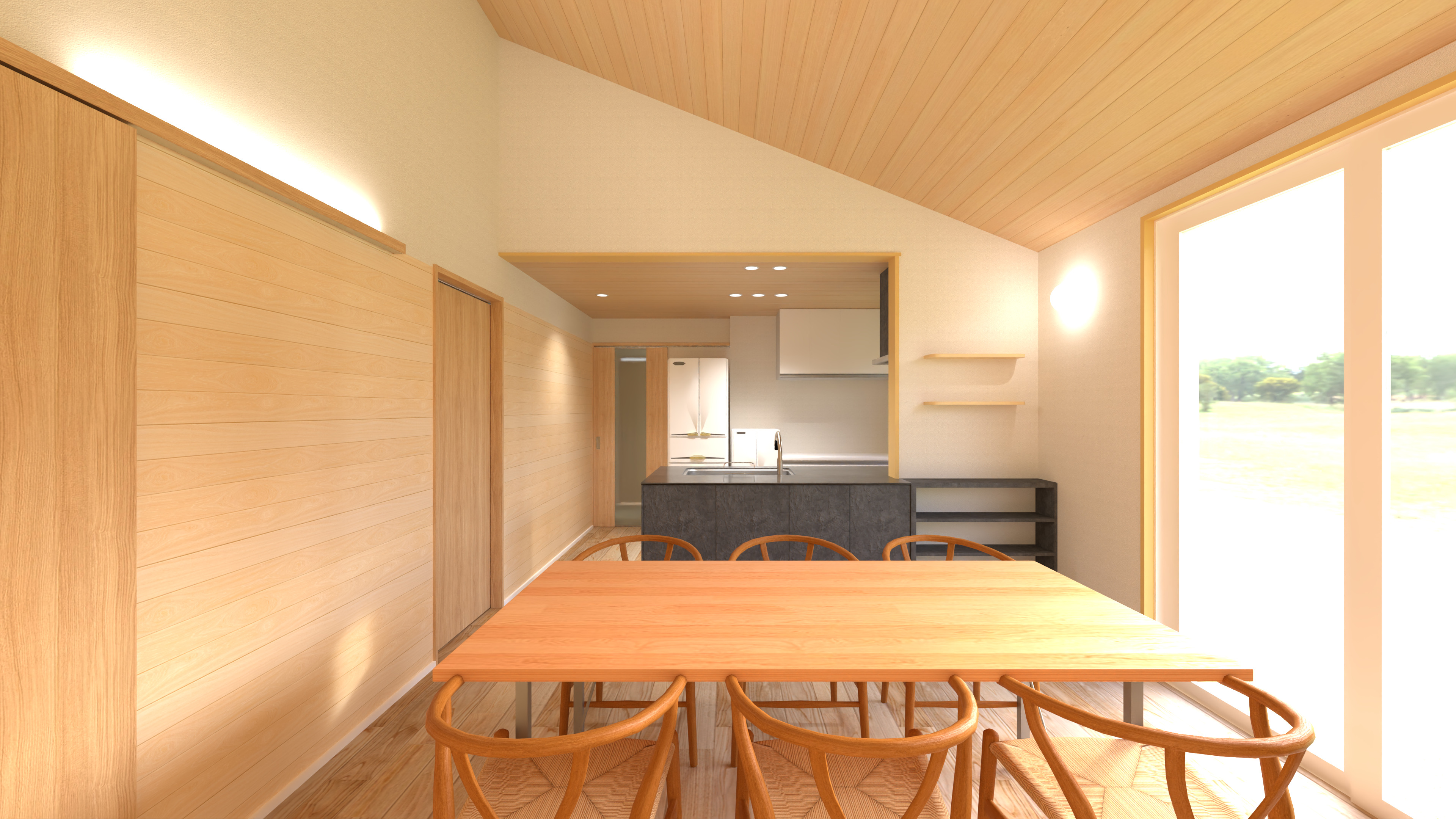 天井から壁面まで贅沢に木材を使用した、温もりあふれるダイニングエリア。大きな開口部からは豊かな光が差し込み、穏やかな家族の時間を育みます。