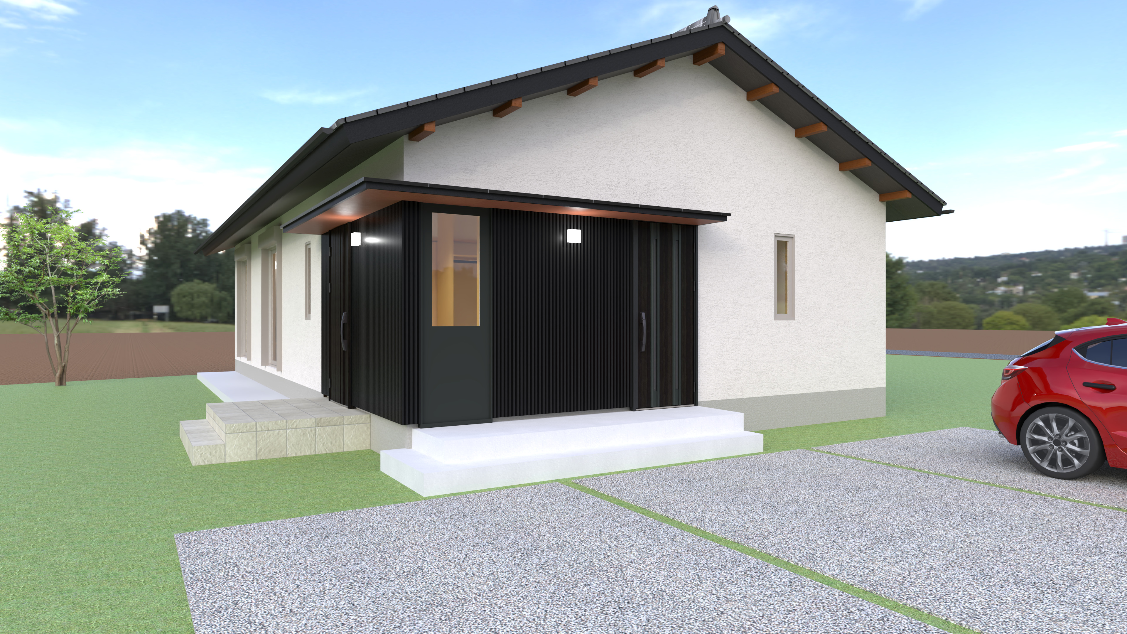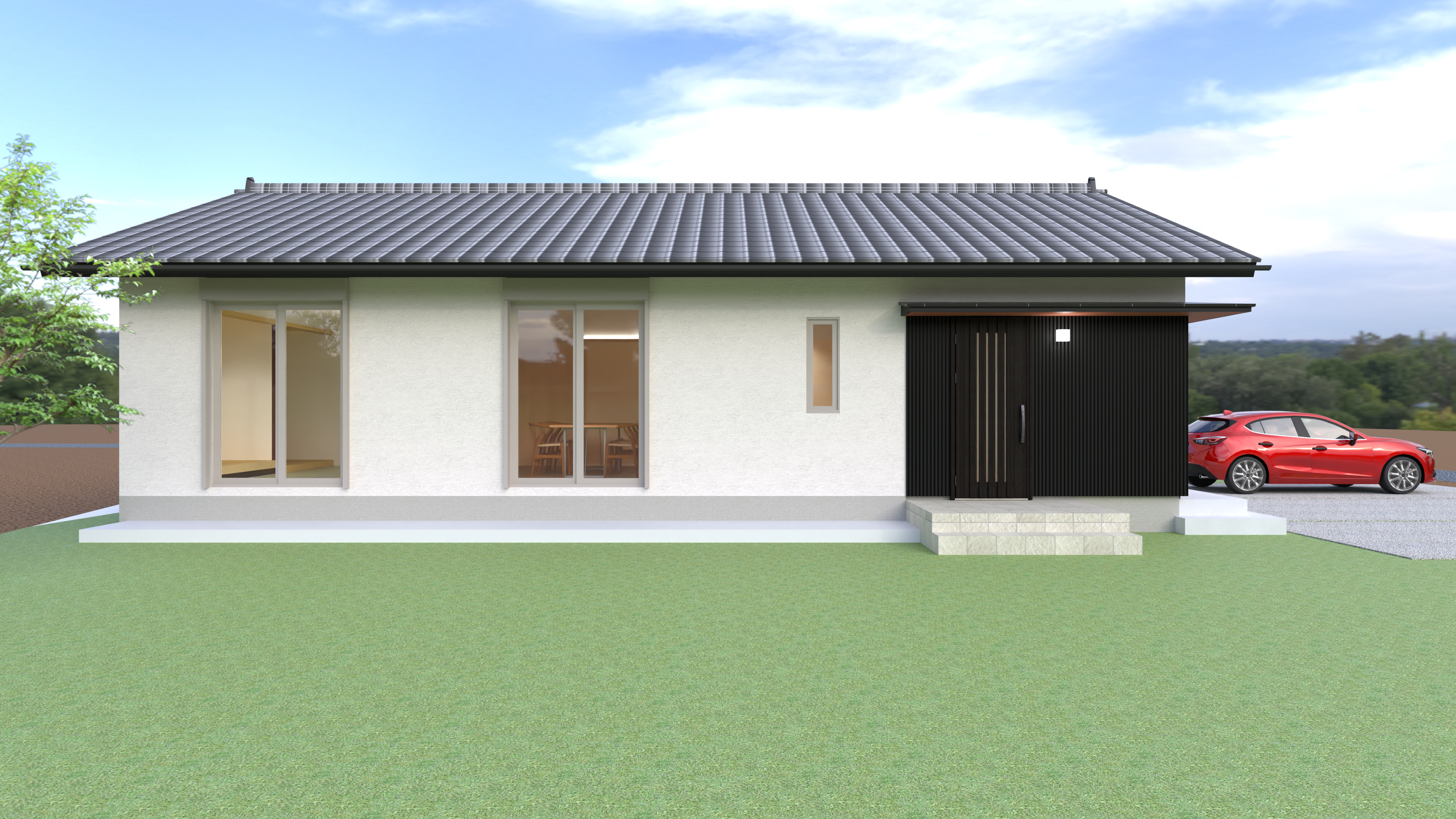 落ち着きのある瓦屋根と、清潔感のある白壁のコントラストが美しい平屋の外観。玄関まわりにあしらわれたガルバリウムがアクセントに。