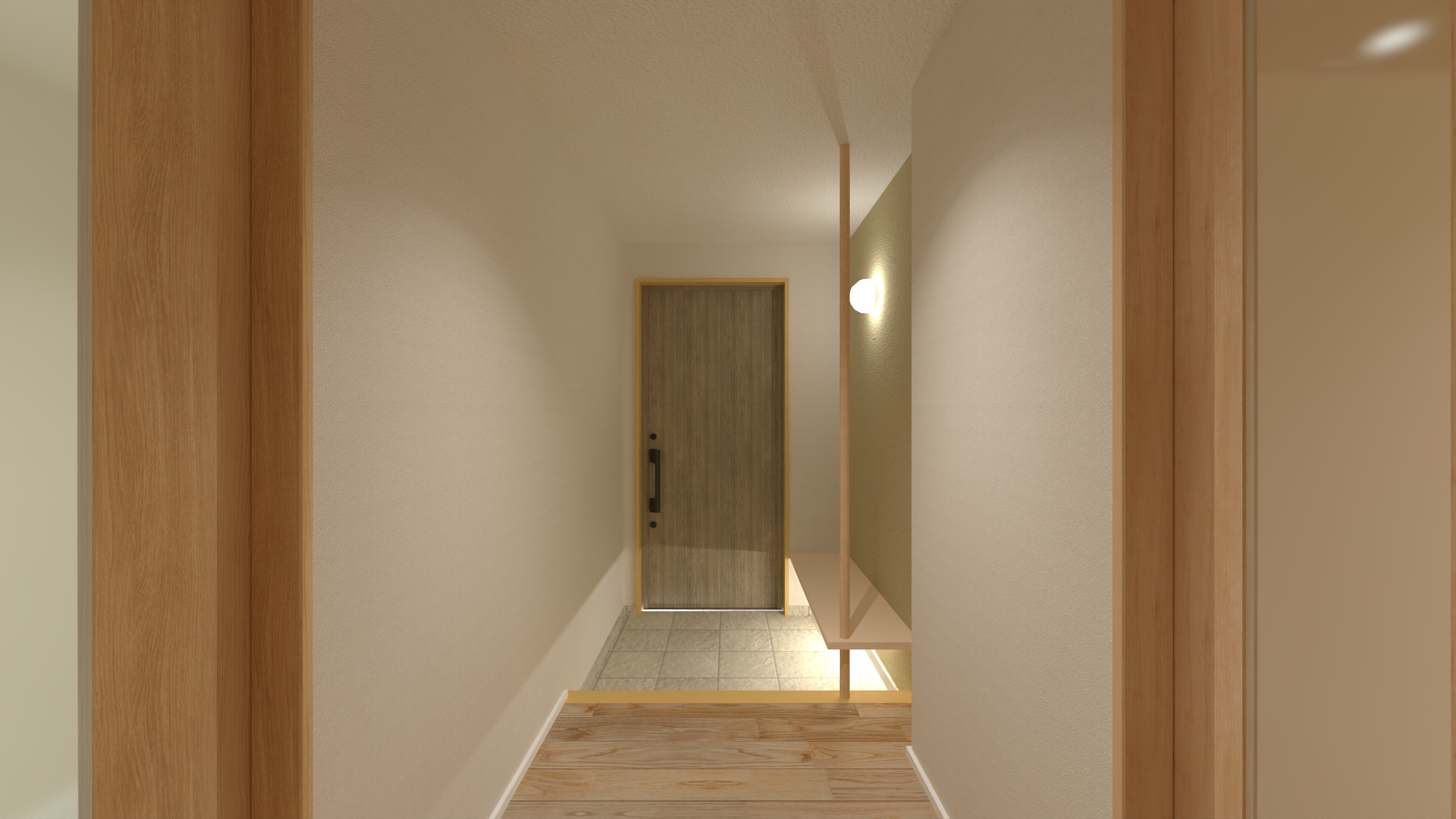 柔らかな間接照明が印象的な玄関ホール。ベンチの下に忍ばせたフットライトが足元を優しく照らし、ゲストを温かく迎え入れます。無垢材の床が心地よく、帰宅した瞬間に心からリラックスできる開放的な空間に仕上がっています。
