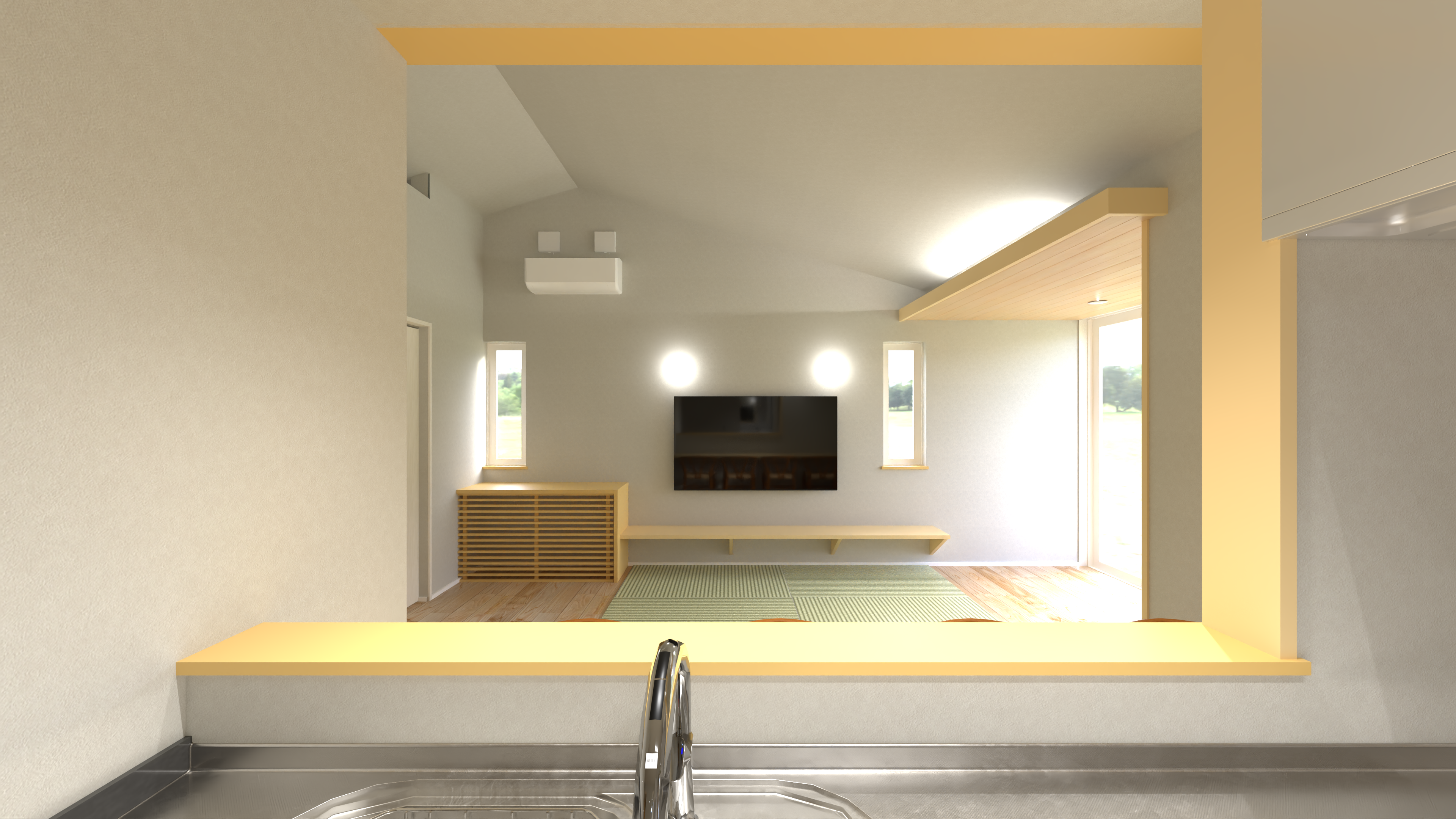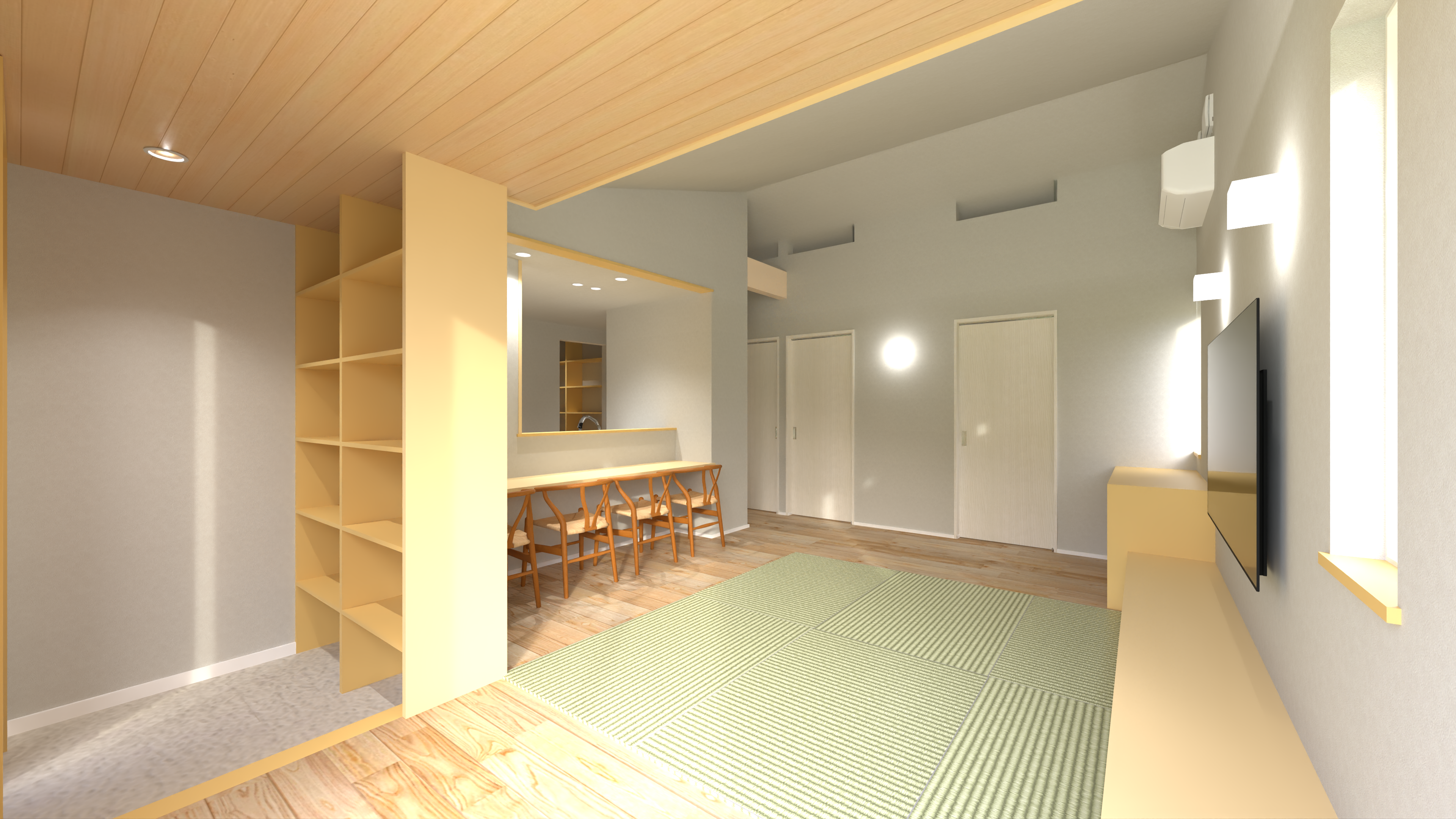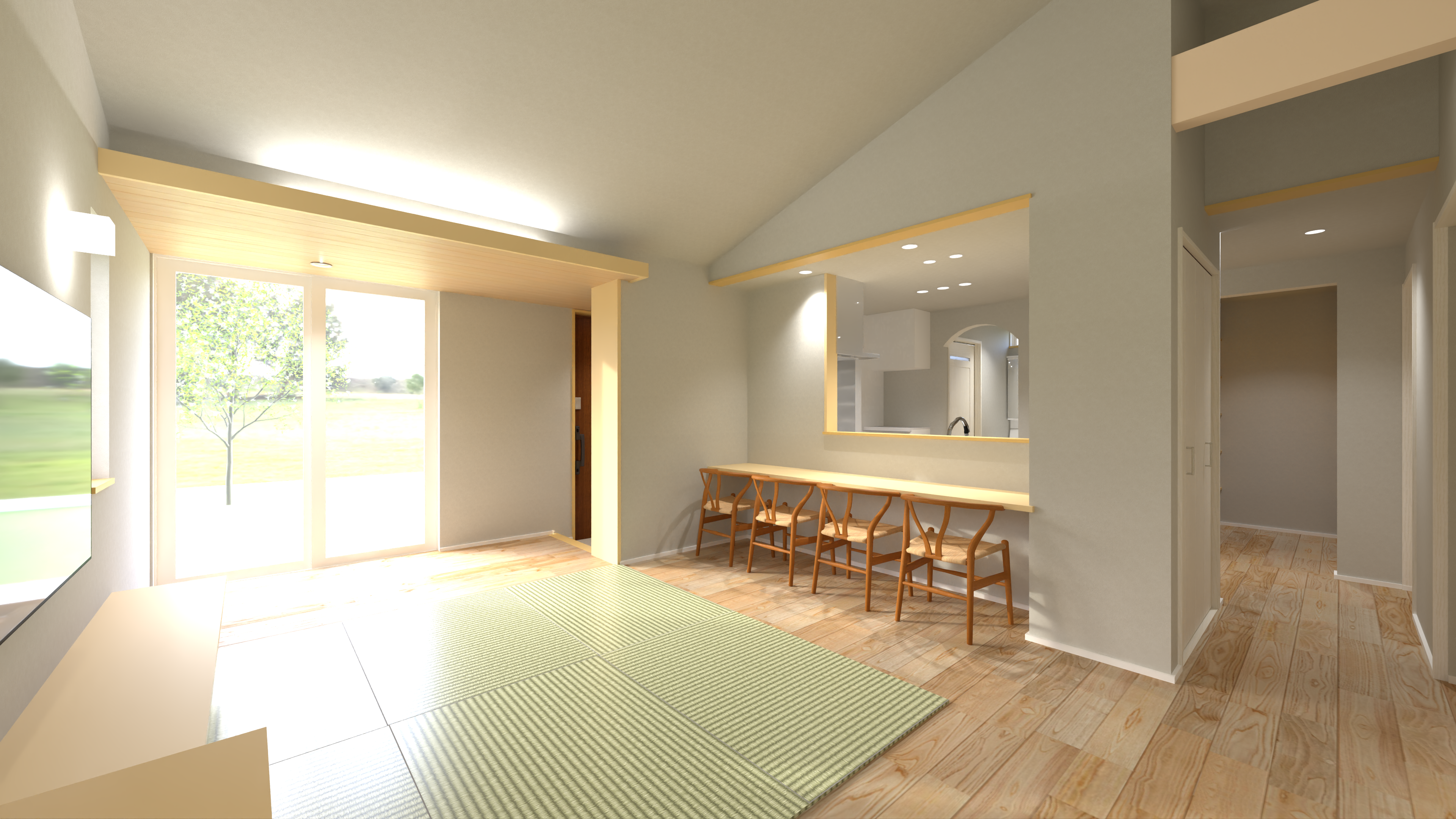 リビングの中心にフラットなタタミコーナーを設け、和の寛ぎをプラスしました。大きな窓から差し込む自然光が、無垢の床材を優しく照らします。キッチン対面に設けられたロングカウンターは、食事やワークスペースとして多目的に活躍。