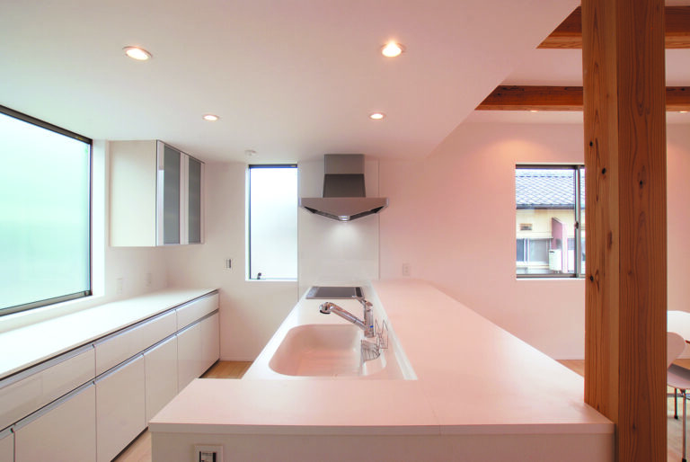 2.造り付けの収納カウンターユニットを設え、対面キッチンユニットの前面カウンターは幅広に設定し、機能とデザイン性をアップ。