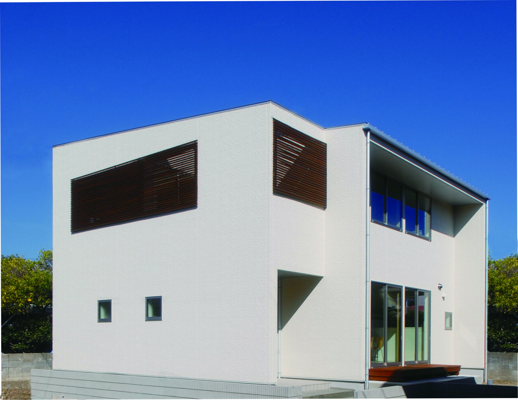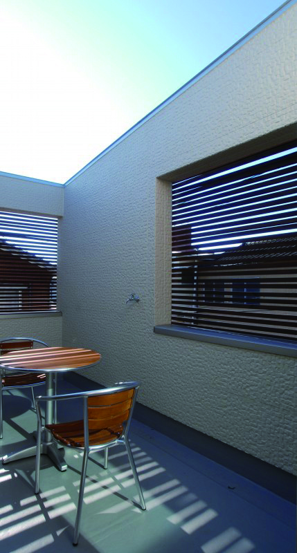 1.室外からの視線を遮る木製ルーバーは、通風の役目と外観デザインの重要なポイント。