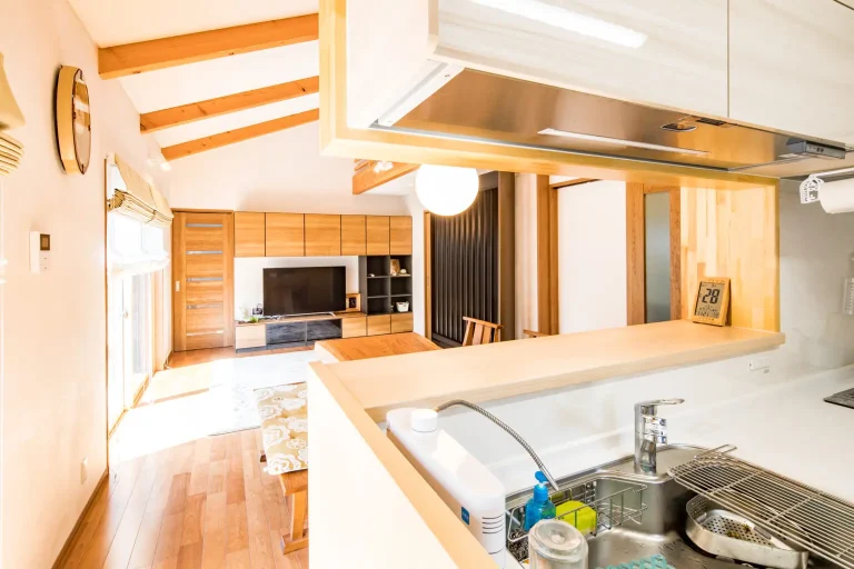 キッチンから見た景色。テレビも見ながら家族も見渡せながら楽しく家事が出来る優れもの