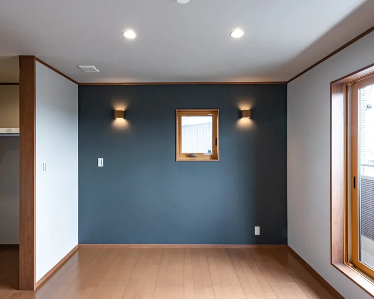 シックなネイビーのアクセントクロスが寝室全体を落ち着いた印象にしてくれます。