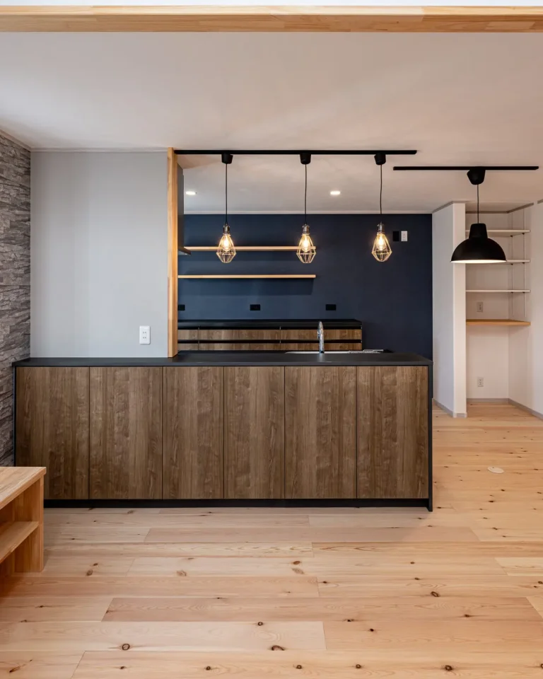ダークブラウンの木目調とマットなブラックの天板でシックな印象。照明もとってもオシャレですね。