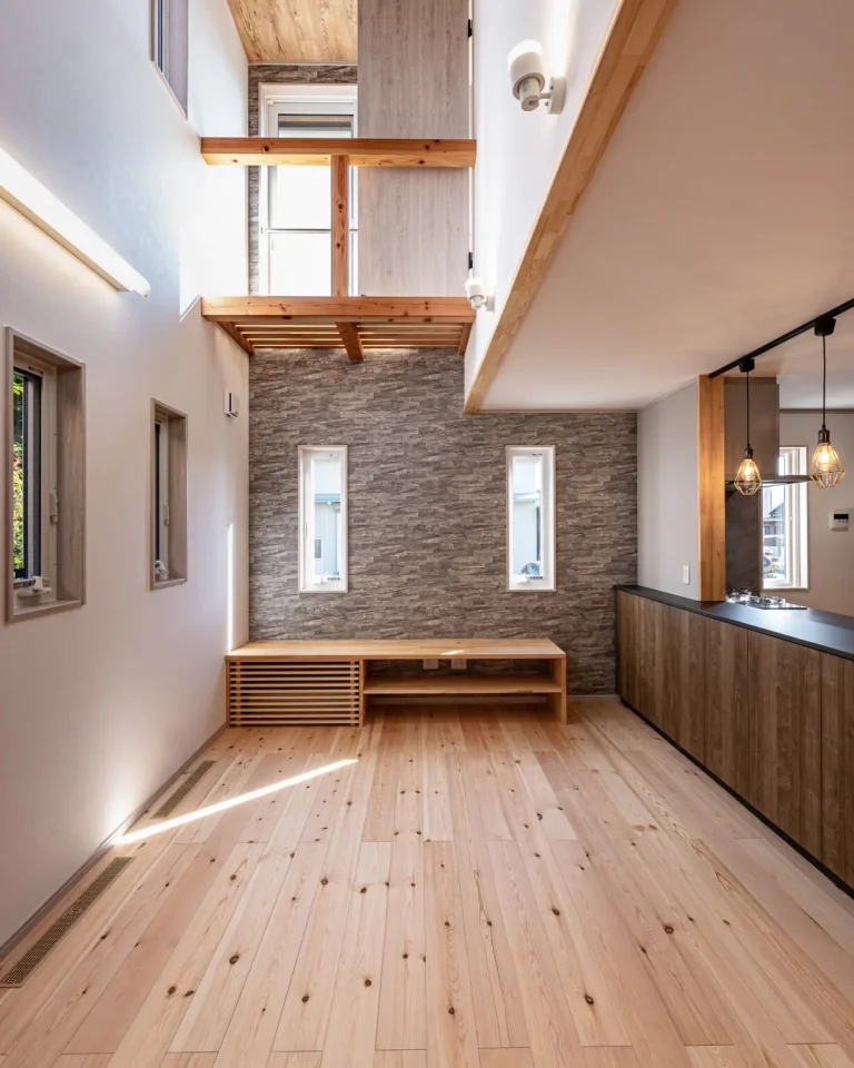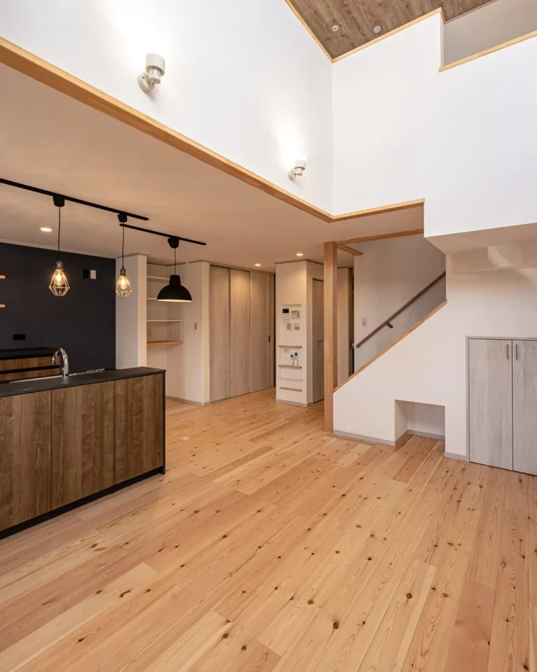 子育て世代のご夫婦とお子さま2人の家族4人で暮らすお住まいです。母屋の隣のカーポートスペースを利用して機能的で住みやすいコンパクトなお家を建てました。設計・間取りを工夫することにより、無駄のない家事動線や集約的な生活動線が実現でき、日々の暮らしが充実し家事などもグッと楽になります。1階リビングの南面には、大きな窓を設けていません。南道路からの目線を気にしなくて良い暮らしを送ることができます。南側に大きな窓がないと部屋が暗くなるのでは…?と思われるかもしれませんが、リビングの一角に開放感抜群の吹き抜けを設け、2階の大きな窓からしっかりと光を取り入れることができます。また、吹き抜けは全館冷暖房との相性がバッチリ!年中室温差の少ない快適な暮らしを送ることができます。