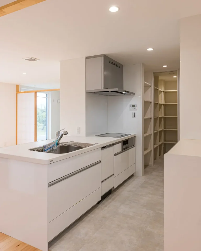 フラット対面の開放的なキッチンにより、LDKのつながりがより強調されます。 フロントオープンの食洗器は、家事を大いに助けます。
