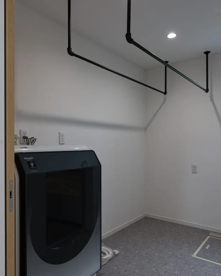 洗濯機から洗濯物を取り出してすぐに干せるように、物干し金物が取り付けられています。洗面所と分離することで、室内干しの充分なスペースを確保しています。
